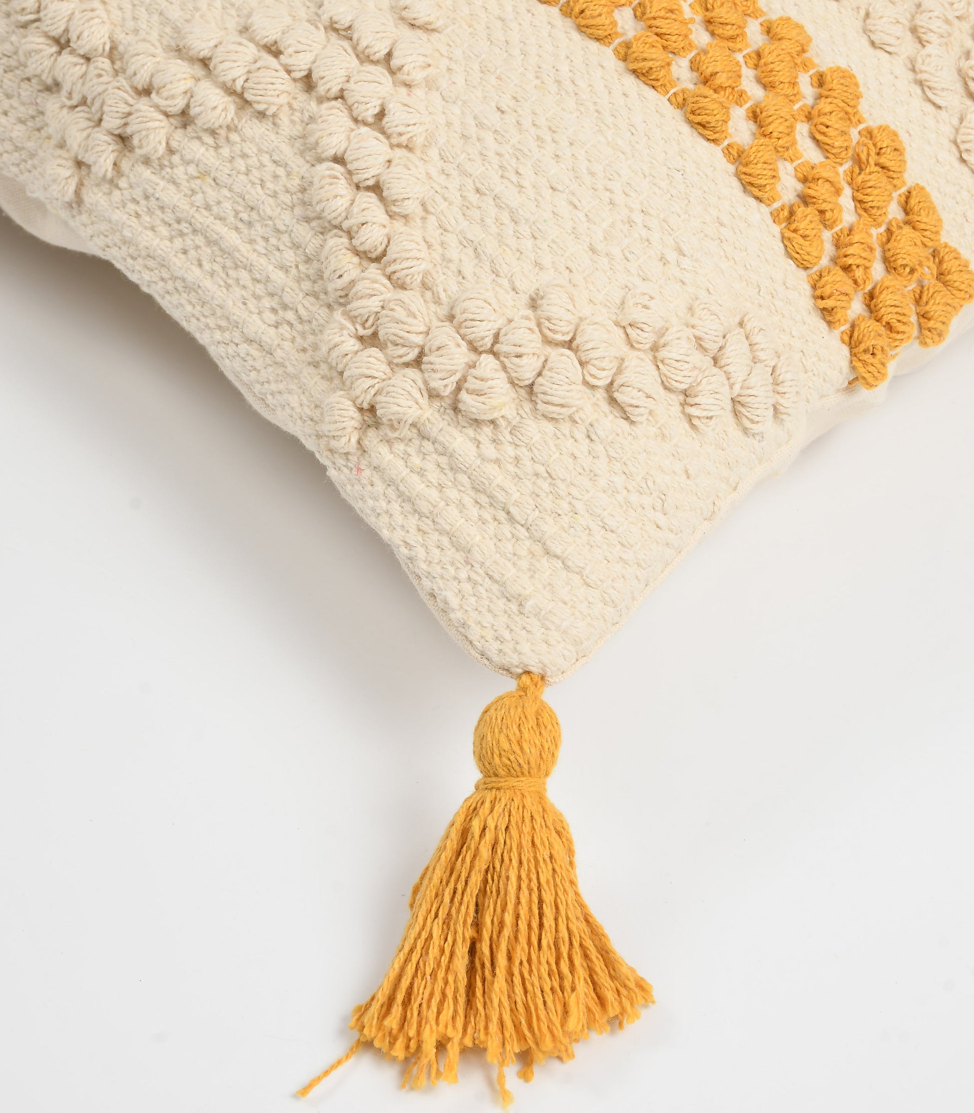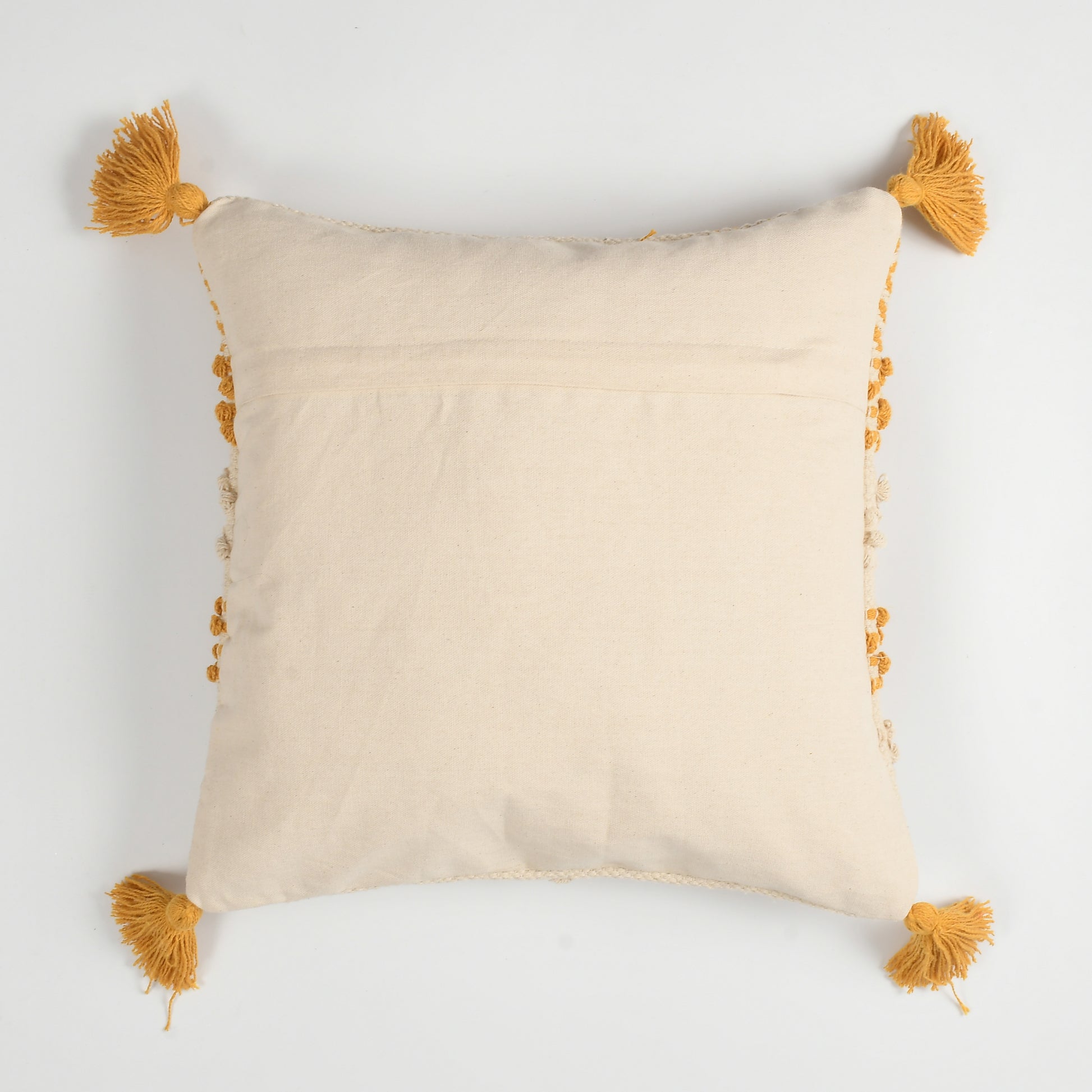 Finished with matching cotton tassels on all four corners, enhancing the cushion’s handcrafted appeal and giving it a cozy, relaxed bohemian look.