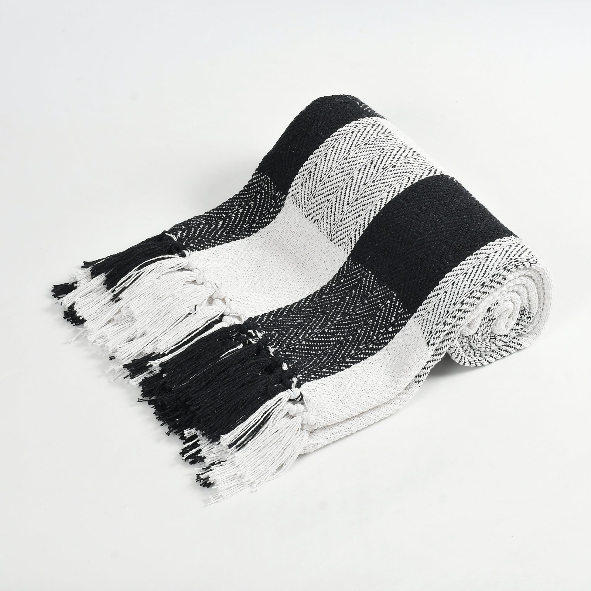 Handwoven Cotton Throw Blanket – Black & White Checkered | Soft Sofa & Bed Throw with Tassels (130×170 cm)